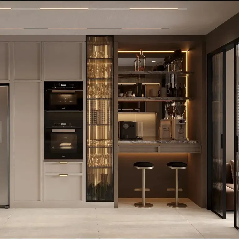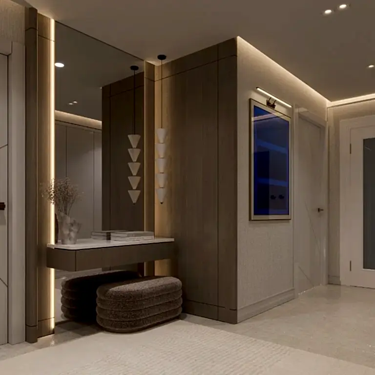 Bunun yanında, aydınlatma ve renk seçimlerinde sıcak tonlar tercih ederek yaşam alanlarına samimi bir karakter kazandırdık. Fonksiyonel mobilyalar ve geometrik düzenlemeler, mekânsal bütünlüğü güçlendirdi.